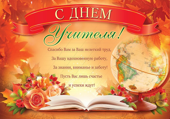Уважаемые учителя, от чистого сердца всех поздравляю с Днём учителя. Желаю нам всем крепкого здоровья и верных сил, устойчивости морального духа и оптимизма, благополучия и семейного счастья, большого уважения и успешного преодоления любых барьеров, замечательного настроения и сопутствующей удачи.